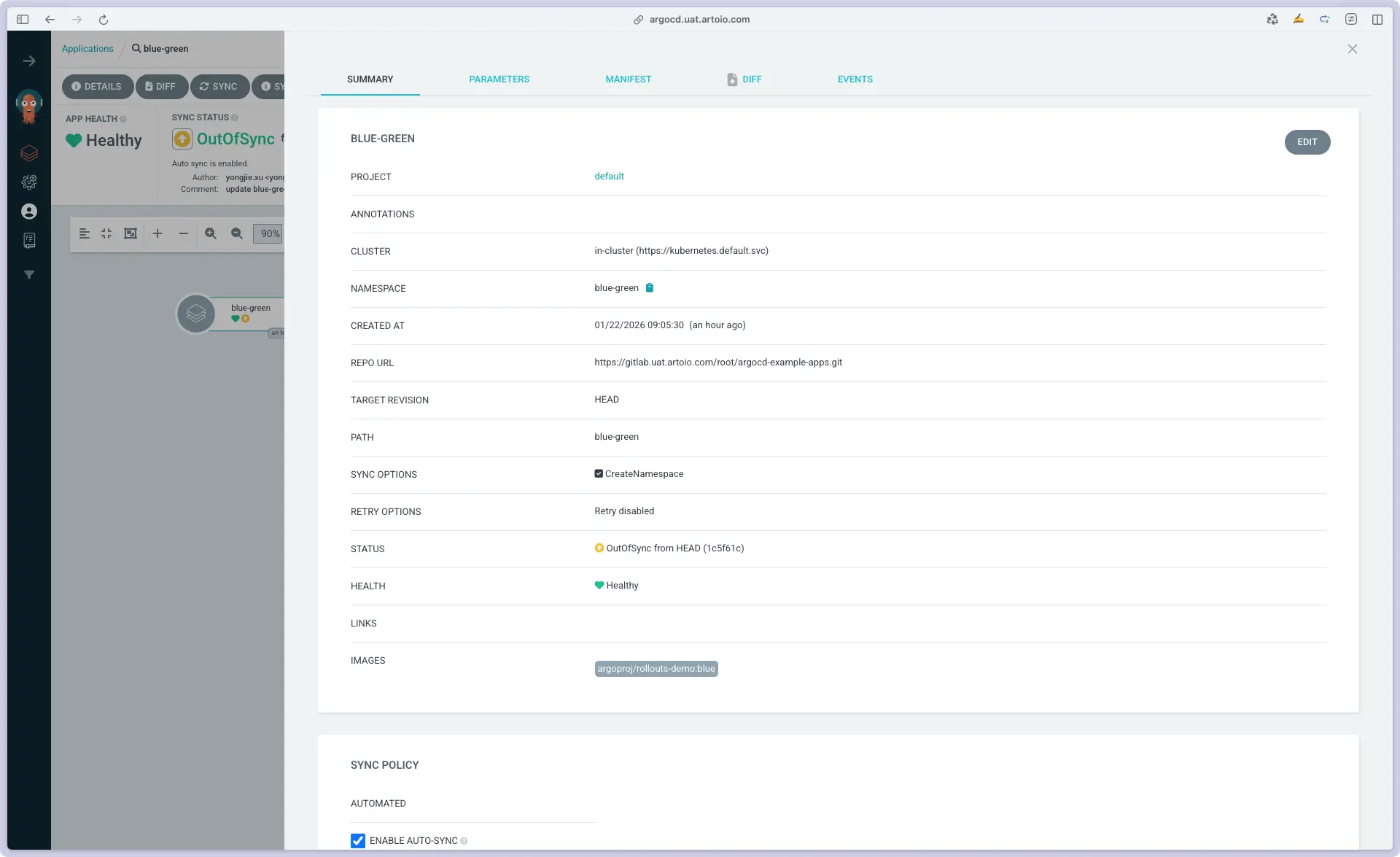 argocd app set argocd/blue-green -p image.tag=green -p image.repository=argoproj/rollouts-demo && argocd app sync blue-green