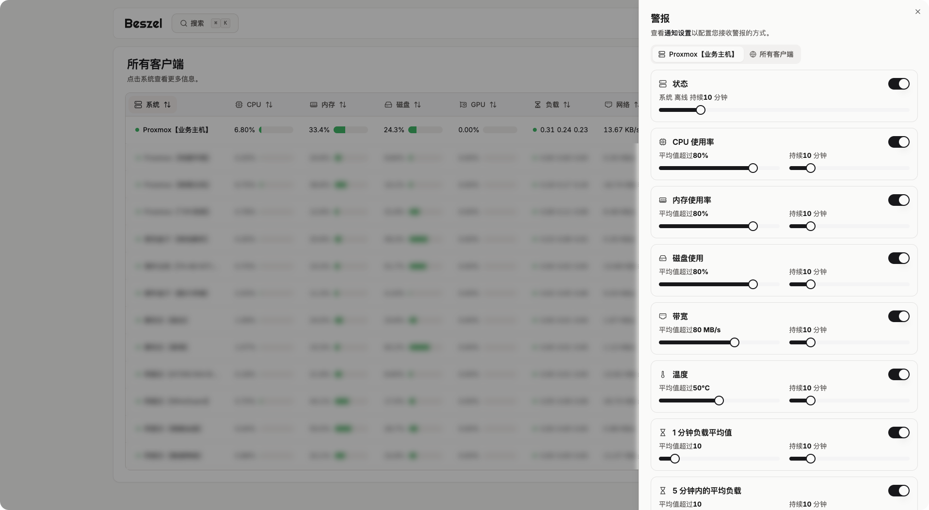 打开 beszel 主页,点击 告警 图标,进入告警配置页面;根据自身需求配置告警指标阈值