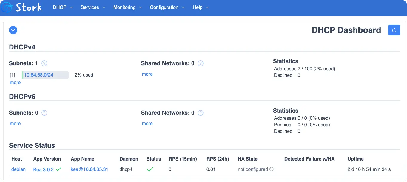 Kea 由 Internet Systems Consortium 开发,是面向现代网络环境的开源 DHCP 服务器,支持 DHCPv4、DHCPv6、动态 DNS 等功能,并通过可扩展的 Hook 模块和 REST API 实现灵活配置与集成。采用数据库后端可提升高可用性和数据共享能力,配合 Stork Dashboard 可实现集中监控与图形化运维管理。