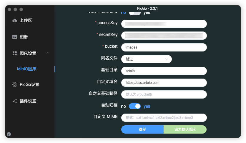 - 自动归档: yes (表示开启,把上传的图片归档到当天日期目录下)